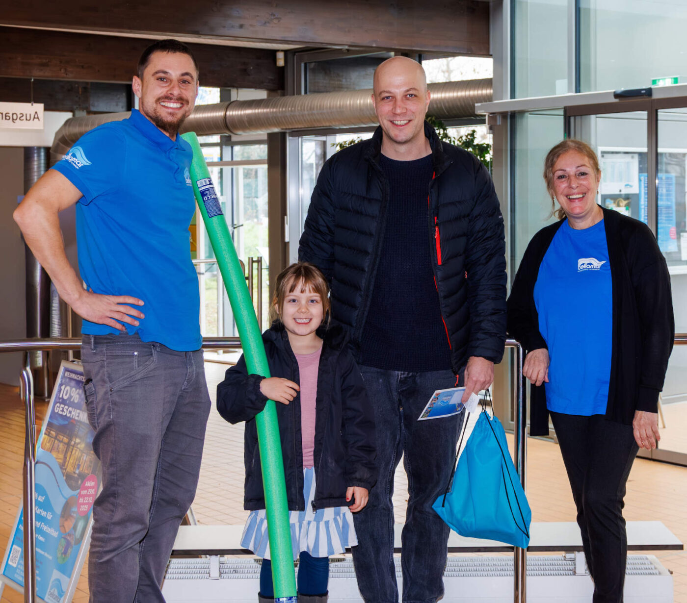 Für das überraschte Geburtstagskind gibt es eine Bellamar-Zehnerkarte, Matilda freut sich über eine Bellamar-Stofftasche mit Wasserbällen, Tauchringen, Schwimmbrille und eine Schwimmnudel. „Das ist wirklich supernett“, sagt der 42-Jährige sichtlich bewegt. „Ich bin schon als Kind mit meinem Vater hierher zum Schwimmen gekommen – das ist bestimmt schon 35 Jahre her. Und ich habe bis heute wunderbare Erinnerungen daran“. Seine Frau und Matildas Schwester wären heute uch gerne mit ins Bellamar gekommen, erzählt er weiter, sie seien aber leider krank geworden. Matilda jedenfalls findet: „Hier ist es echt klasse und ich freu mich auf´s Planschen mit Papa“.