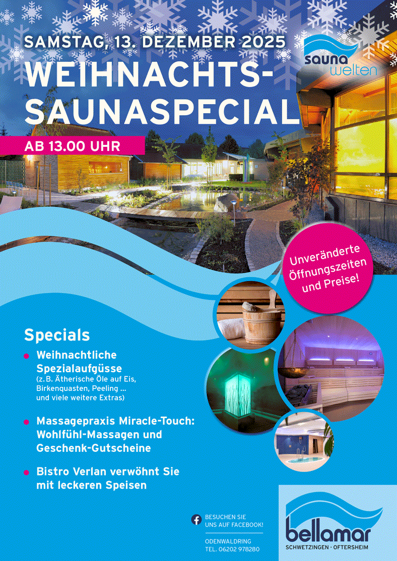 8. Dezember 2025 Saunaspecial am 13.12.2025 ab 13:00Uhr! Specials Weihnachtliche Spezialaufgüsse (z. B. Ätherische Öle auf Eis, Birkenquasten, Peeling… und viele weitere Extras) Massagepraxis Miracle-Touch: Wohlfühl-Massagen und Geschenk-Gutscheine Bistro Verlan verwöhnt Sie mit leckeren Speisen